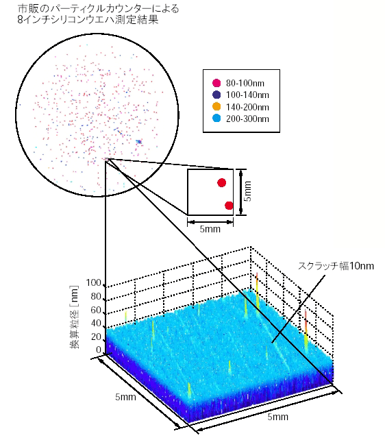 The middle left figure shows the result of measured particles on the surface of an 8-inch Si wafer with a conventional particle counter. The bottom left figure shows the result in an area of 5mm×5mm on the same Si wafer with the developed measuring system. It turns out that our system can detect particles with diameters smaller than 50nm, which is difficult to accomplish with the conventional particle counter. In addition, this system is able to measure nanostructures on the surface, such as scratches of approximately less than 10 nm in width. |
